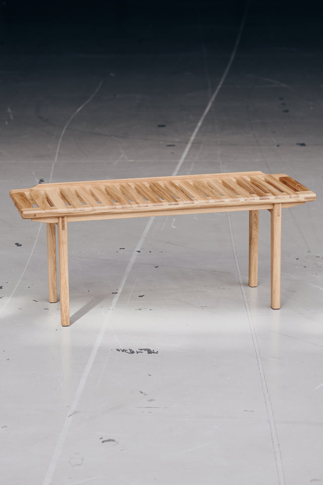 Bænken er ikke kun et funktionelt møbel, men også en æstetisk tilføjelse til dit hjem. De tappede ben, den dekorative liste under sædet, og de præcist fræsede lameller i stellet giver bænken sin unikke karakter. Den kan bruges med eller uden hynde og passer ubesværet ind i ethvert rum.